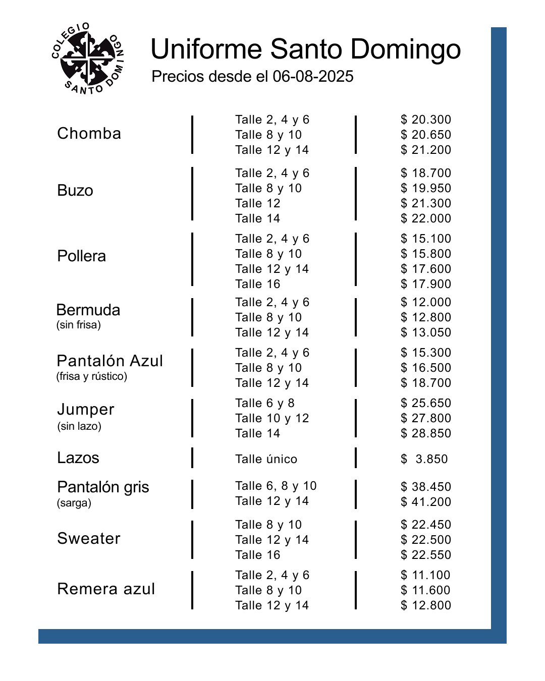 Comprá el uniforme oficial del Colegio Santo Domingo en .soylu. Hacé tu pedido por WhatsApp y recibí el producto sin cargo en tu domicilio o en la puerta del cole para probar el talle. Nuestros talles son amplios y podés usar las tablas de medidas como referencia. Brindamos atención personalizada y te asesoramos en todo momento.