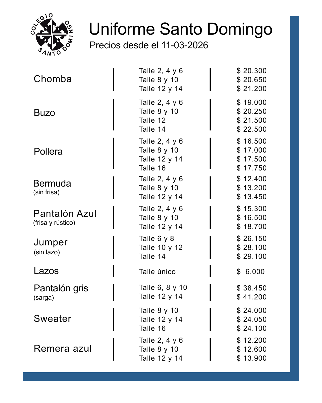 Comprá el uniforme oficial del Colegio Santo Domingo en .soylu. Hacé tu pedido por WhatsApp y recibí el producto sin cargo en tu domicilio o en la puerta del cole para probar el talle. Nuestros talles son amplios y podés usar las tablas de medidas como referencia. Brindamos atención personalizada y te asesoramos en todo momento.